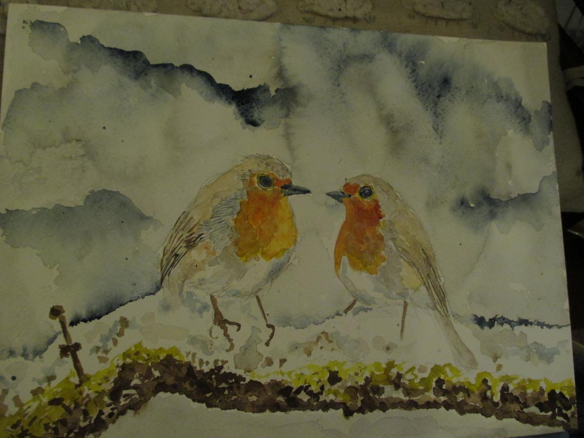Oltre ai tanti cuori ci sono i miei acquarelli, i gatti, i paesaggi e gli uccellini. Una coppia di pettirossi si guarda negli occhi su un ramo innevato pieno di muschio, quanto mi piace dipingere le piccole creature del cielo, cogliendo un fremito d’ali insieme ad uno sguardo che non è mai disattento, i loro occhietti vivaci disposti ai lati del capo sembrano percepire tutte le frequenze dell’etere.